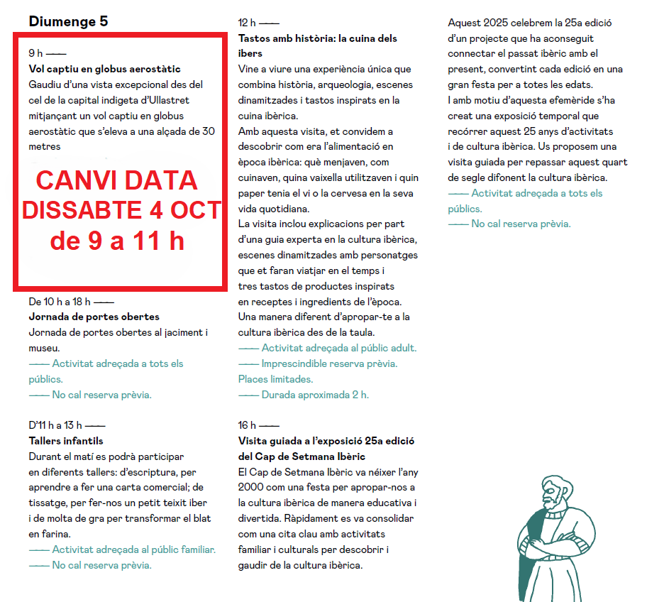 Aquest 2025, per celebrar la 25a edició, el Cap de setmana ibèric d’enguany esdevé una nova ocasió per descobrir d’una manera divertida a través de reconstruccions històriques, tallers d’experimentació, visites guiades i teatralitzades i una petita exposició dedicada als jaciments de les tribus ibèriques, i celebrar aquesta efemèride tal com ho feien els ibers ara fa més de 2.000 anys